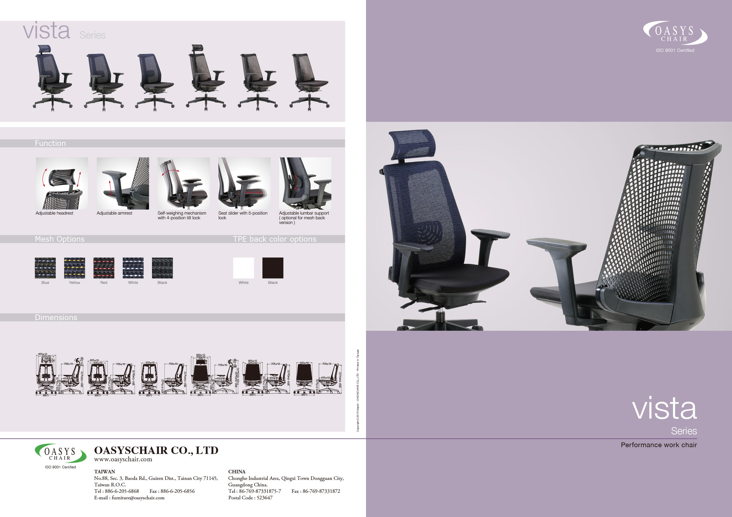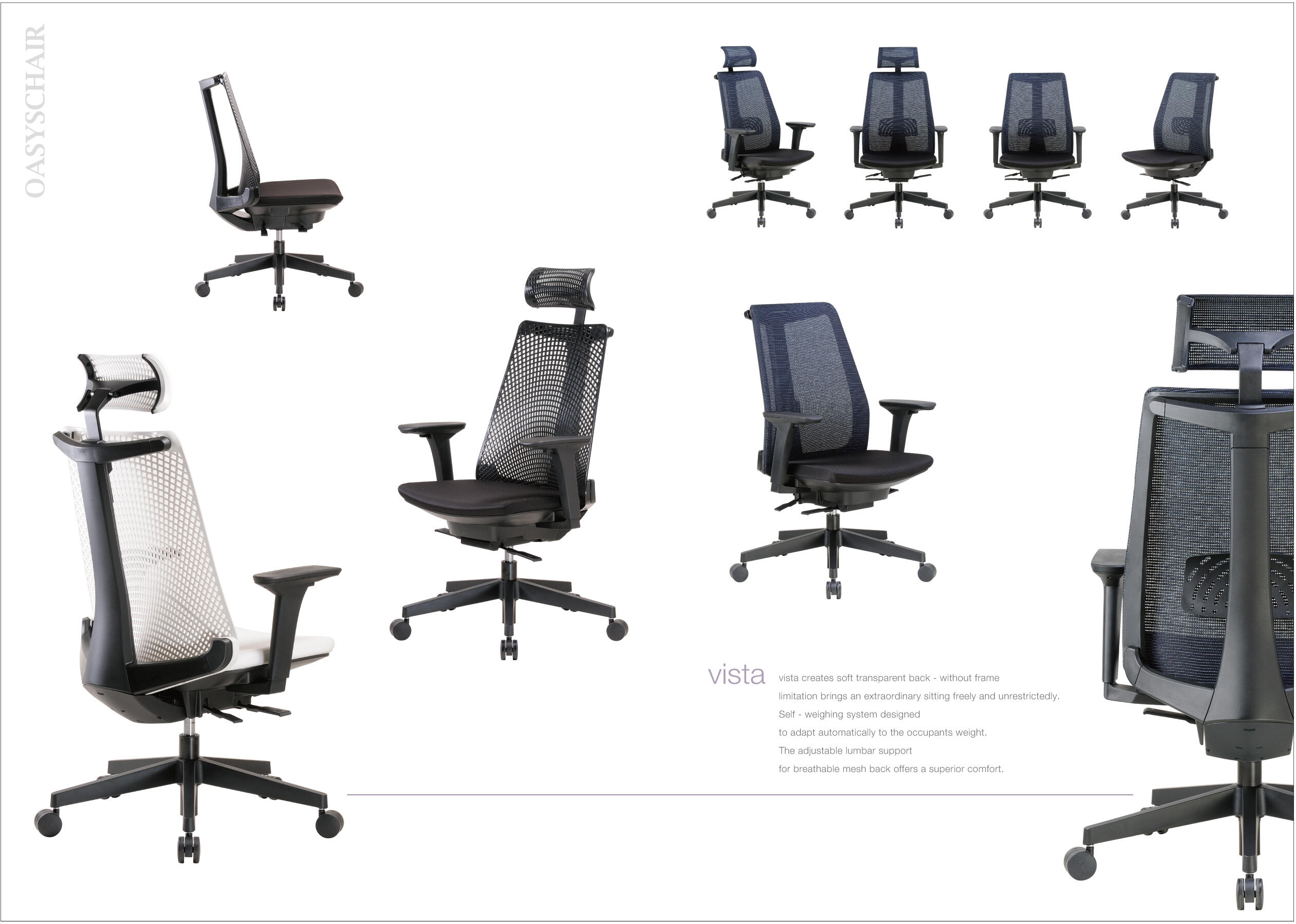 Vista creates soft transparent back- without Frame limitation brings an extraordinary sitting freely and unrestricted. Self-weighing system designed to adapt automatically to the occupants weight. The adjustable lumbar support for breathable mesh back offers a superior comfort.