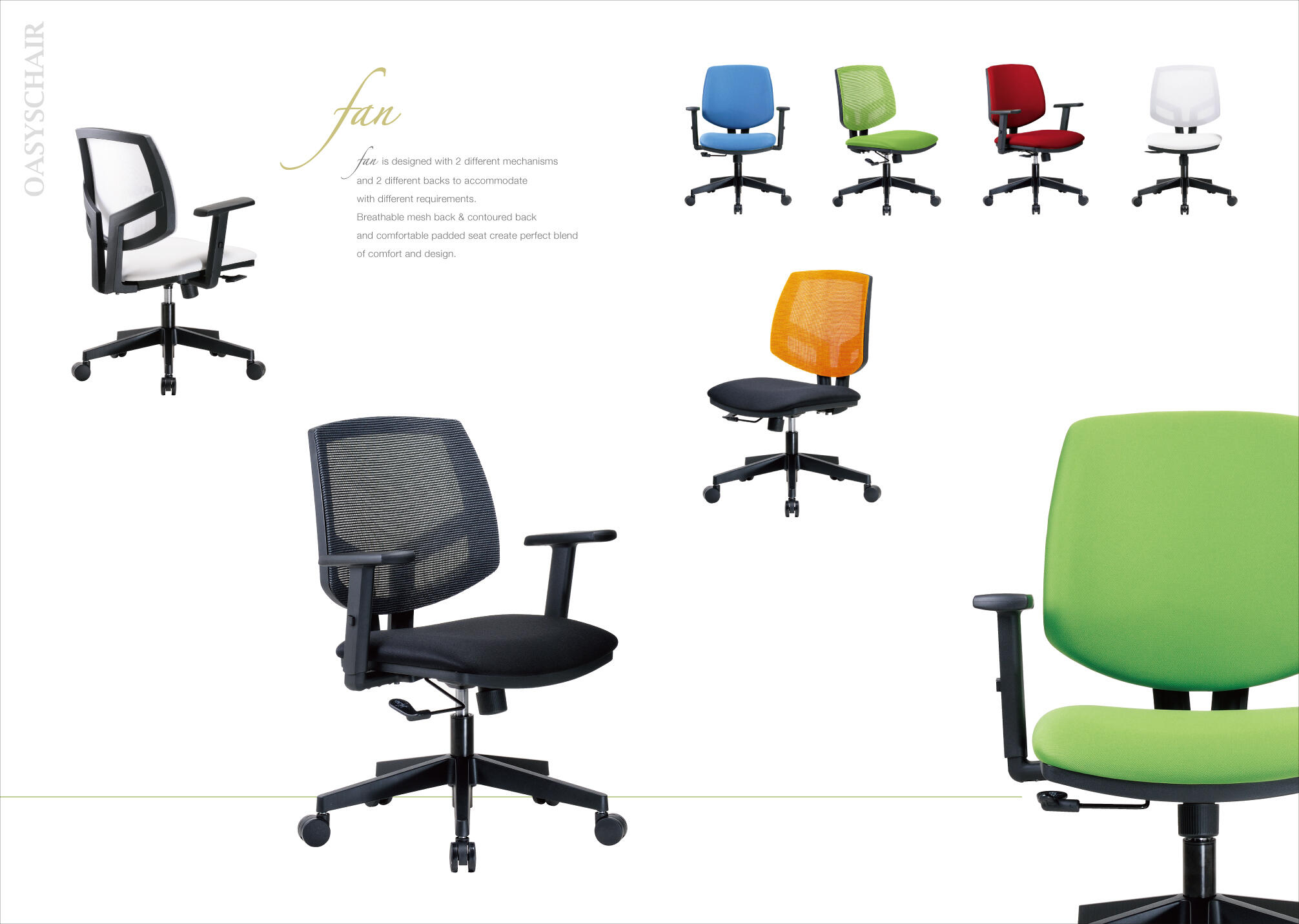 Fan is designed with 2 different mechanisms and 2 different backs to accommodate with different requirements.Breathable mesh back & contoured back and comfortable padded seat create perfect blend of comfort and design.