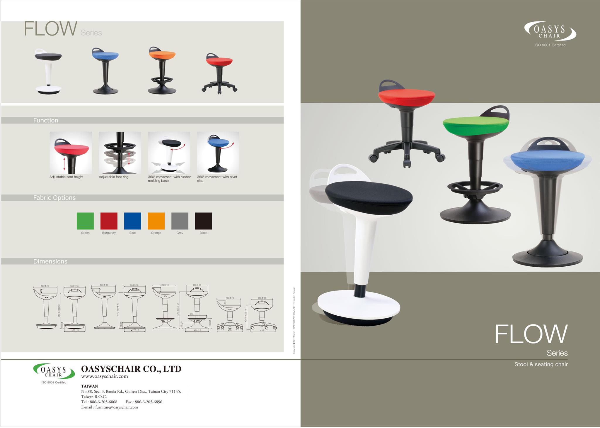 Flow is a product with lightweight, and groove around seat for carrying. The height adjustment is incorporated into the bottom of the seat. Also, the chair allows 360° movements because of rubber molding base, and pivot disc. These designs allows users feel more free when they sit on the chair. A valuable support when you do not want to sit down. The ease of adjustability encourages variation in seat height.