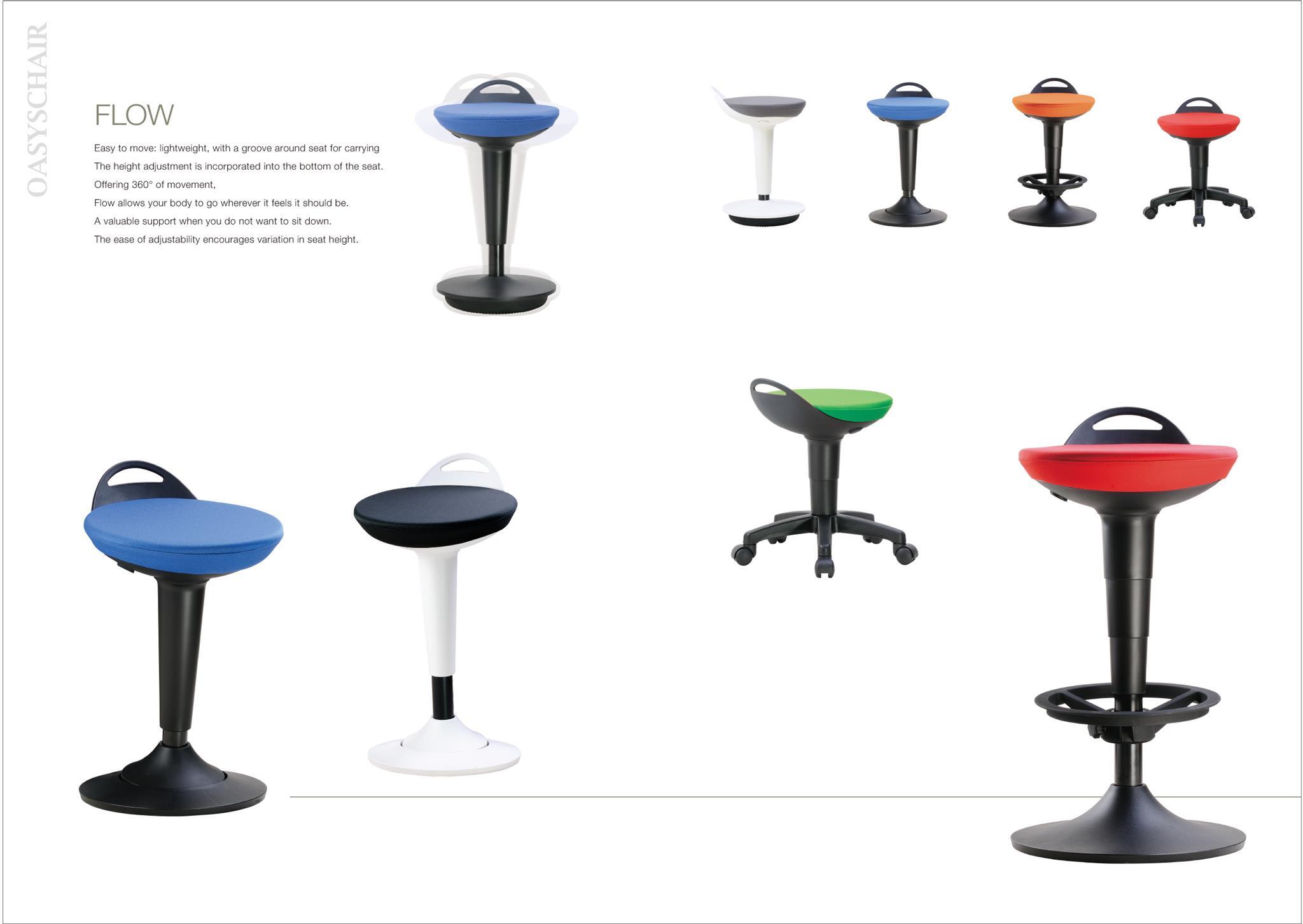 Flow is a product with lightweight, and groove around seat for carrying. The height adjustment is incorporated into the bottom of the seat. Also, the chair allows 360° movements because of rubber molding base, and pivot disc. These designs allows users feel more free when they sit on the chair. A valuable support when you do not want to sit down. The ease of adjustability encourages variation in seat height.
