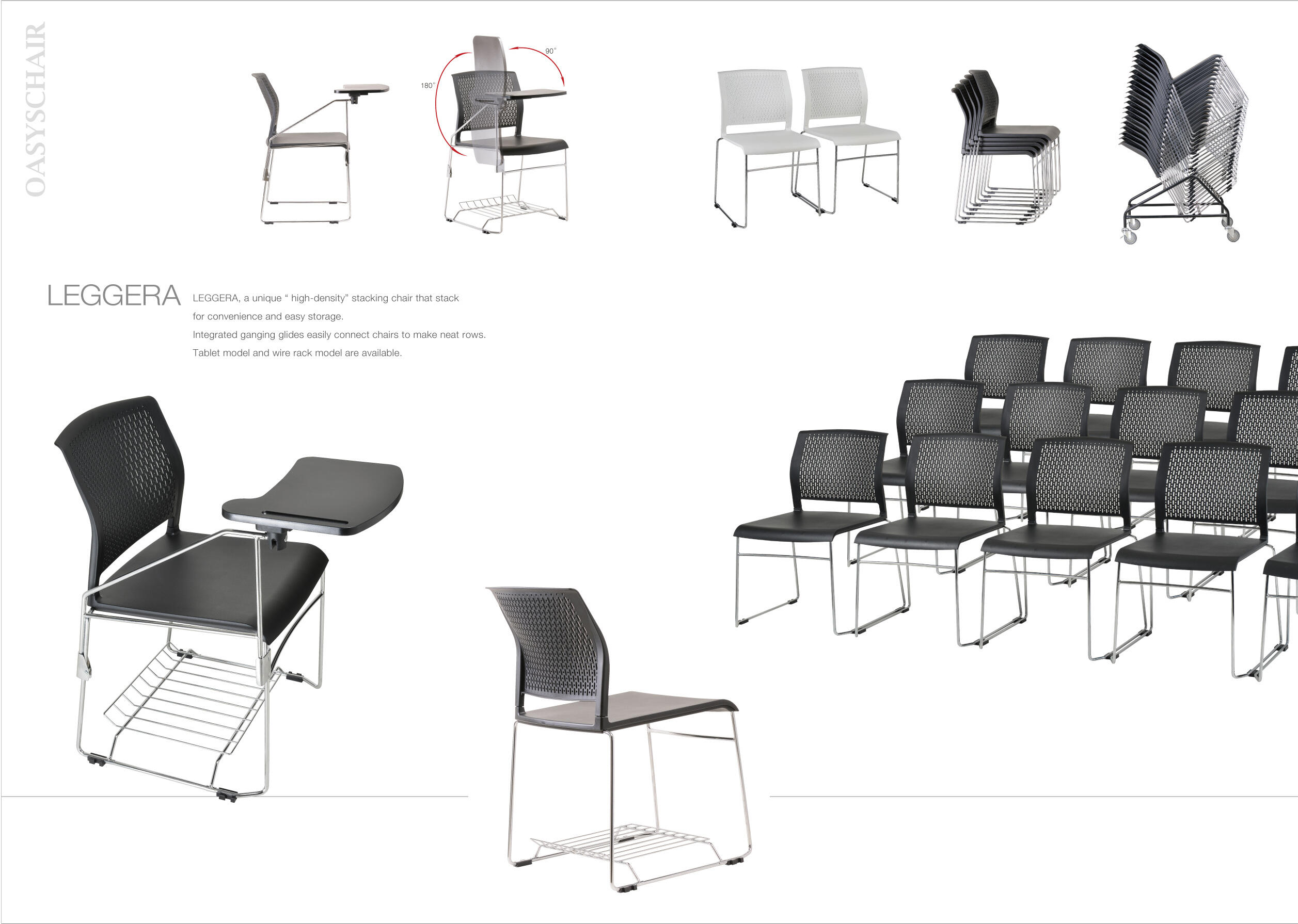 LEGGERA, a unique "high,-density" stacking chair, that stack for convenience and easy storage. Integrated ganging glides easily connect chairs to make neat row. Tablet model and wire rack model are available.